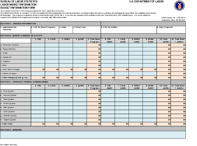 Office of Management and Budget Paperwork Reduction Act Approval: The Bureau of Labor Statistics (BLS) received OMB approval of the LMI Cooperative Agreement (CA) application package through 06/30/2024. Under this approval, changes in the work statements will be reviewed every year by the OMB and published in the Federal Register for 30 days if any of the changes are deemed substantive to the information collection burden. The OMB approval number for the LMI Cooperative Agreement is 1220‑0079.