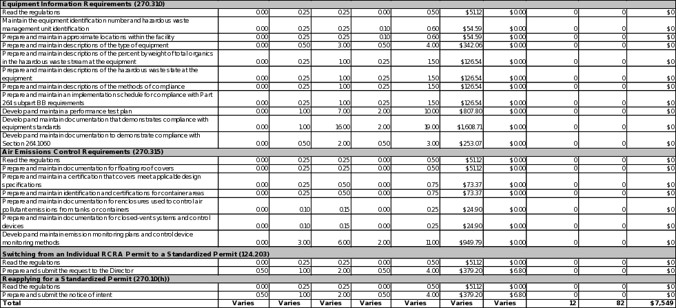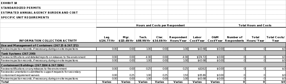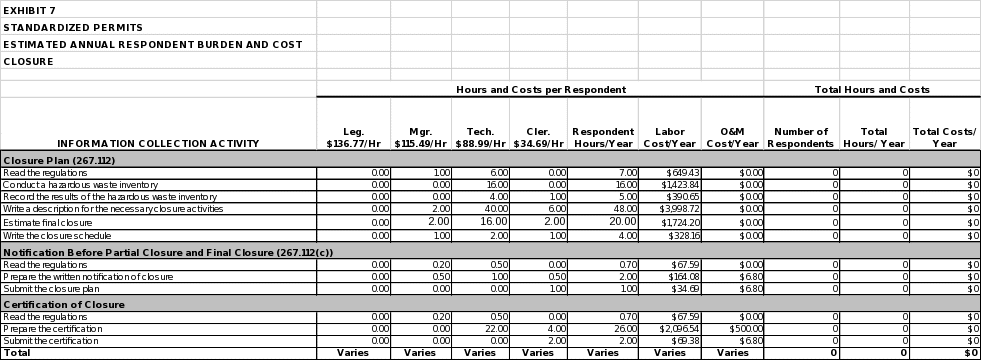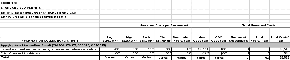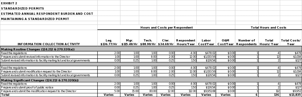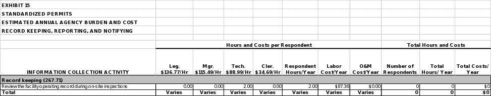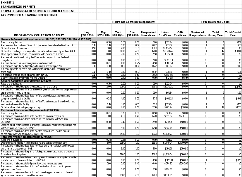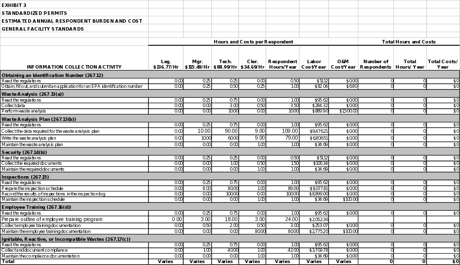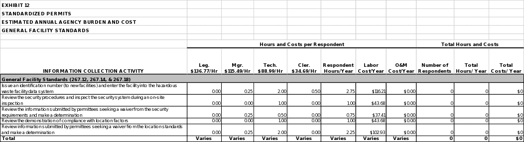 The original ICR for the standardized permit rule included estimate for the number of eligible facilities, and for facilities expected to apply for the standardized permit. Since the rule was promulgated in 2005, 12 states have received authorization for the rule (AR, ID, IL, IN, KS, MT, NV, OK, SD, TX, VA and WY) and only one facility has been issued a standardized permit. For the purposes of this ICR, EPA assumes that no facilities will be either applying for or reapplying for a standardized permit during the three-year period of this ICR.