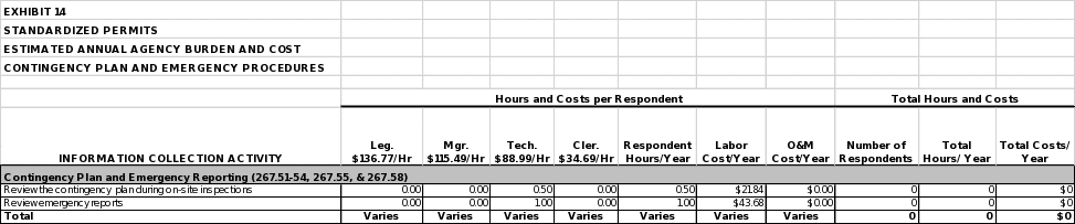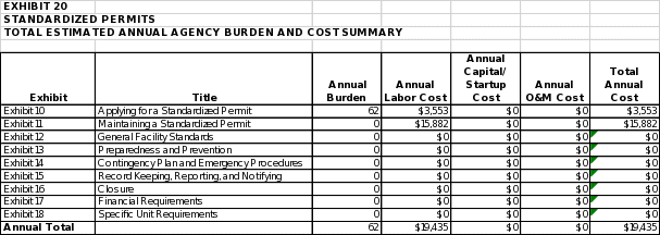 Exhibit 20 summarizes the estimated Agency burden associated with all activities covered in this ICR. As shown in the exhibit, EPA estimates that the annual agency burden is approximately 62 hours, at an annual cost of $19,435.