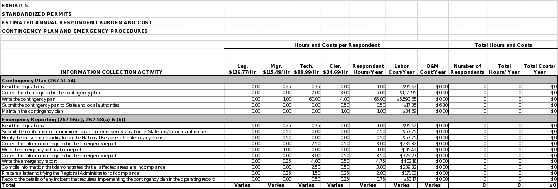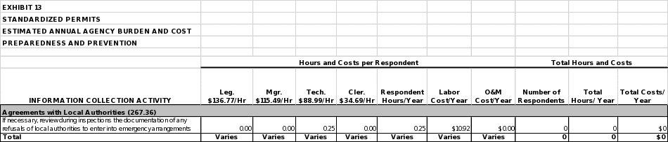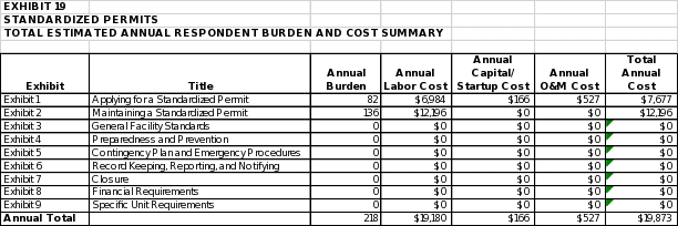 Exhibit 19 summarizes the total annual respondent burden and cost associated with all the requirements covered in this ICR. As shown in the exhibit, EPA estimates that the annual respondent burden to be approximately 218 hours, at an annual cost of $19,873. Annual capital/operation & maintenance costs are estimated at $693.
