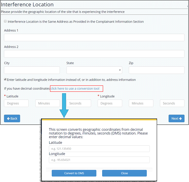 The next section is to identify the geographic location of the site that is experiencing the interference. Here, the user will have the option to enter address information, latitude and longitude information, or both. If the interference location is the same as the complainant’s location, the user should check the box for “Interference Location is the Same Address as Provided in the Complainant Information Section.” If the user wishes to enter latitude and longitude information, they should check the box for “Enter latitude and longitude information instead of, or in addition to, address information.” In addition, there is also an option to convert decimal coordinates to DMS via the integrated conversion tool. To access this menu, press the link that reads “click here to use a conversion tool” located above the latitude and longitude fields.