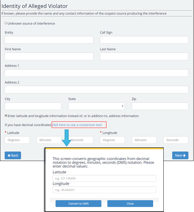 The next section is to identify the geographic location and any contact information for the suspect source producing the interference. Here, the user will have the option to enter address information, latitude and longitude information, or both. If the source of the interference is unknown, the user should check the box for “Unknown source of interference”. If the user wishes to enter latitude and longitude information, they should check the box for “Enter latitude and longitude information instead of, or in addition to, address information.” In addition, there is also an option to convert decimal coordinates to DMS via the integrated conversion tool. To access this menu, press the link that reads “click here to use a conversion tool” located above the latitude and longitude fields.