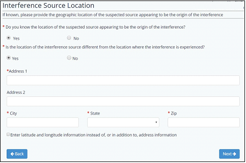 This section is to identify, if known, the location of the suspected source appearing to be the origin of the interference. The first question that appears on this form is asking if the user knows the location of the suspected source appearing to be the origin of the interference.