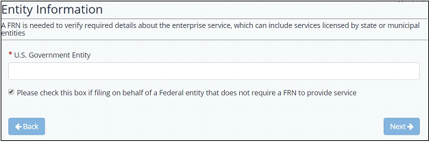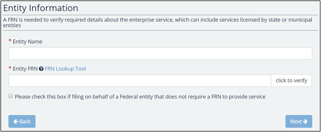 The first step in submitting the Enterprise Interference form will be to identify your entity name and FRN, if applicable. When entering an FRN, please keep in mind that a valid FRN is identified as a 10-digit FRN that has at least one license designated for commercial use. Once an FRN is inputted, the user will press the “click to verify” button to verify. If you are filing on behalf of a Federal entity that does not require a FRN to provide service, then you may check the appropriate checkbox shown below.