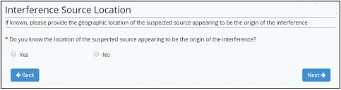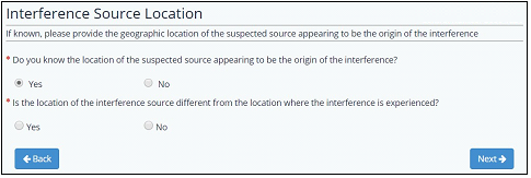 Selecting “No” will enable to user to move forward to the next section of the form. Selecting “Yes” will prompt the user another question about whether the location of the interference source is different from the location where the interference is experienced.