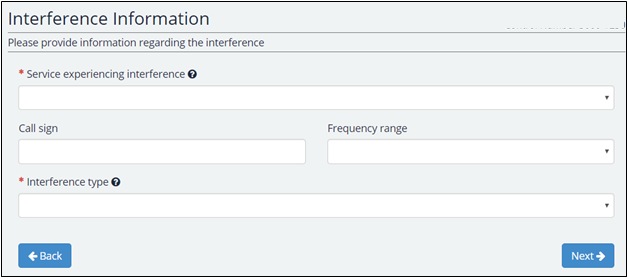 The next section is the interference information form section. Here, the user will enter information regarding the service which is experiencing interference and what is causing this. In addition, there are optional fields for Call Sign and Frequency Range.