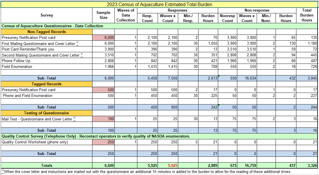 The table below shows the total burden calculated for the Census of Aquaculture. The questionnaires will be mailed out in December of 2023 and the data collection will be completed by March 2024. The total projected burden of 3,326 hours will be a onetime occurrence, rather than an annual average.