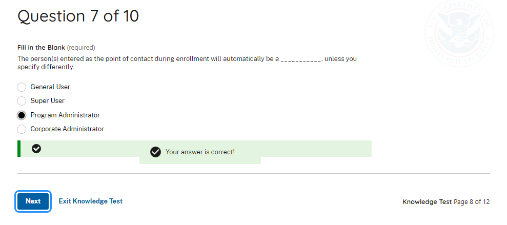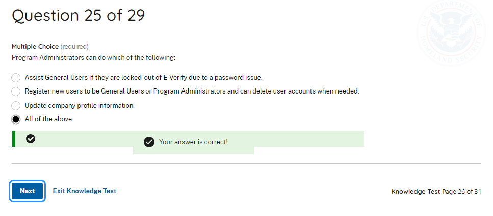 The Knowledge Check with 28 questions should load for PA and GU users on both Employer and Employer Agent accounts for all category types EXCEPT Federal Contractor with FAR Clause. |