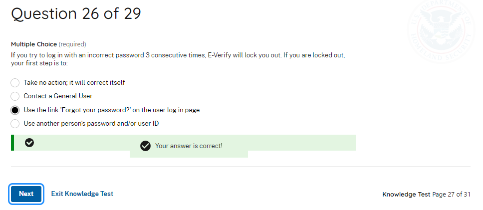 If you try to log in with an incorrect password three consecutive times, E-Verify will lock you out. If you are locked out, your first step is to: