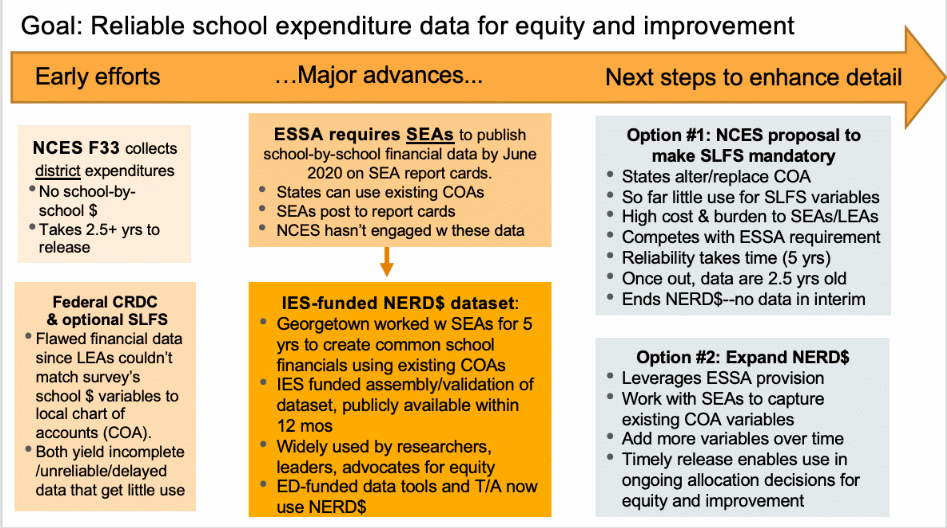 Especially as we head into the post COVID financial storm, states and districts should not have to re-do systems and charts of accounts to accommodate NCES, when they could harness existing data systems instead.