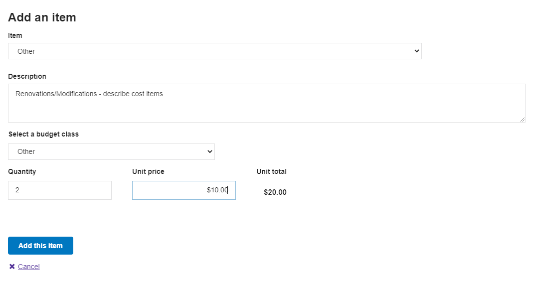 | Step B. Click “Add an item,” and select “Other” for all secondary services. In “Description”, describe which secondary service you are adding. For example, select “Other” and then list in the description “Renovations/modifications” and provide a summary of the cost items as appropriate. Select “Other” for “budget class” and fill in the quantity and unit price. Select “Add this item” to include it in your application. | ||||||||||||||||||||||||||||||||