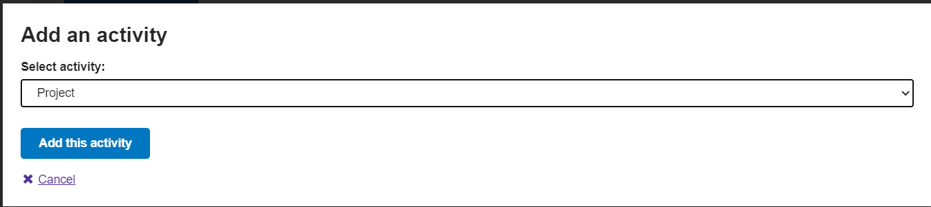| Step 2. Once selected, click the blue box titled "Add activity." A new dialog box will open, then select "Project" and click on the blue "Add this activity" box. | ||||||||||||||||||||||||||||||||