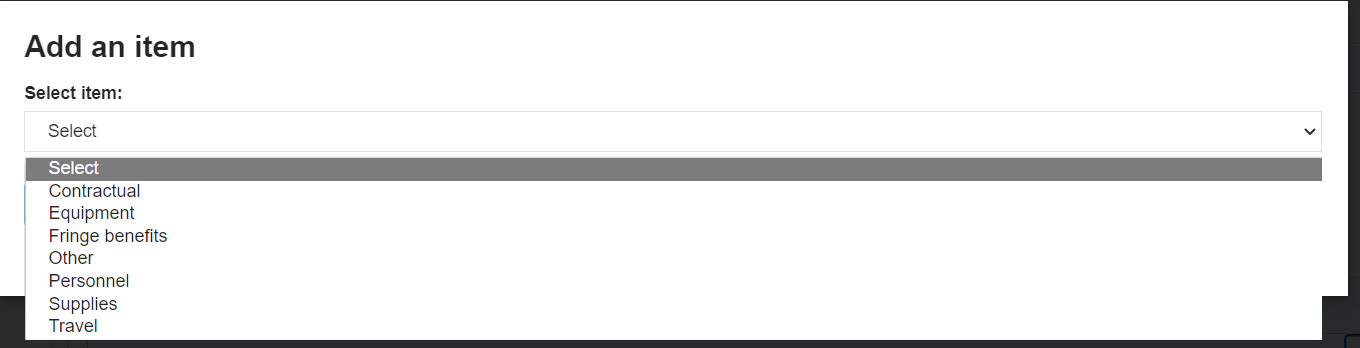 | Step 4. Once completed, select the “+ Add an item” box and a new dialog box will open with the crosswalked terms from Table 1 in the drop-down menu. Please select the appropriate primary service cost from the associated term in the drop-down menu below (e.g., “Shelter” costs = “Contractual”). | ||||||||||||||||||||||||||||||||
