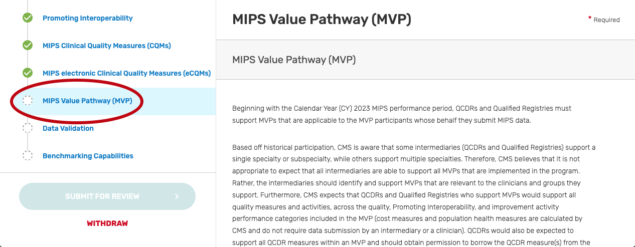 MIPS Value Pathway (MVP) tab – Intermediaries may specify the MVPs supported for the 2023 MIPS performance period. Please note, the list of MVPs reflects what is finalized in the CY 2022 Physician Fee Schedule Final Rule for the QPP. MVP availability is subject to change, based upon what is finalized for inclusion and removal in the CY 2023 Physician Fee Schedule Final Rule for the QPP. In addition, voluntary, opt-ins, and virtual groups are currently excluded from MVP reporting.