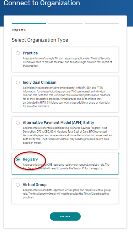 Please note, you must have the “Security Official” role assigned to access, complete, and submit the Self-Nomination form for your organization(s). If you do not have the “Security Official” role, please submit a request to your organization’s “Security Official” via the QPP website. If you are the “Security Official” for your organization, you may add this role to the appropriate staff via the QPP website. Users can request access as a “Security Official” on the Manage Access page by clicking the “Connect to another Organization” link. You will be able to identify the QCDRs/Qualified Registries where the “Security Official” role has been approved as they are listed on the Manage Access page. The list of organizations that you can self-nominate will match the list of organizations displayed on the Manage Access page under the Registry option (QCDR/Qualified Registry entities). If you know the organization that you need to self-nominate is active on the QPP website and it is missing from this list, then you need to follow the steps above to “Connect to an Organization” in the “Security Official” role.