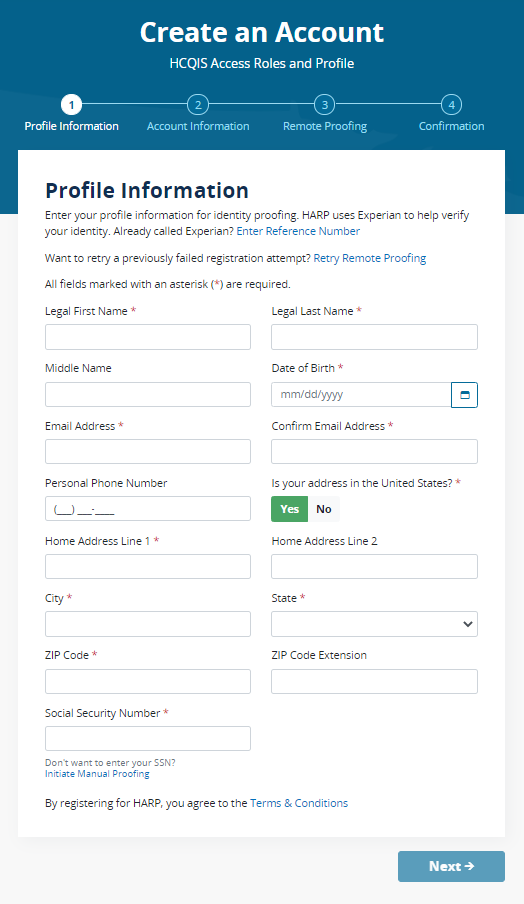 Click on “Register with HARP” to create your account. This process could take 5-15 minutes depending on how quickly your data is verified. HARP uses a third-party service provided by Experian to verify your identity. This may require your social security number. Please select the “Security Official” role.