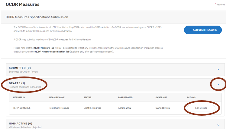 Please ensure that all QCDR measures are in the “Submitted to CMS” status before the close of the self-nomination period (8 p.m. ET on September 1). QCDR measures that are in a “Draft”, or “Non-active” status will not go through the CMS consideration process for use by the self-nominating QCDR.