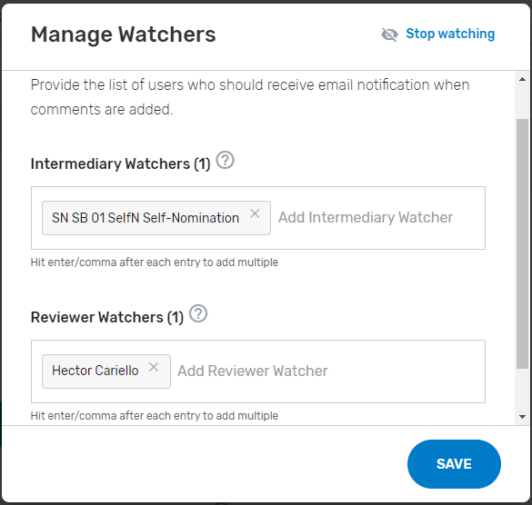 Add ‘Watchers’ to monitor the status of your Self-Nomination form. This feature allows intermediaries to create a list of users who should receive an email notification when comments are added.