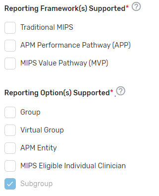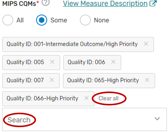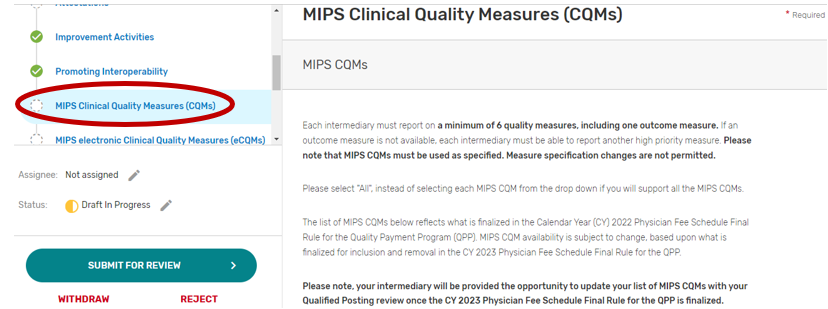 MIPS Clinical Quality Measure (CQM) tab – Intermediaries are required to select the individual MIPS CQMs supported for the 2023 MIPS performance period. QCDRs and Qualified Registries must support at least six quality measures, with at least one outcome measure. If an outcome measure is not available, at least one other high priority measure should be used. Please note, some MIPS CQMs are also available as MIPS electronic clinical quality measures (eCQMs) and should be used as specified. Changes to the measure specifications are not permitted.