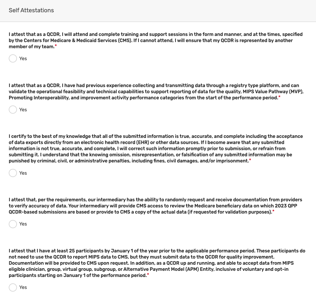 Disclaimer: A majority of the screenshots used in this section of the User Guide were taken from the QCDR Self-Nomination form. Corresponding fields of the Qualified Registry Self-Nomination form may slightly differ.