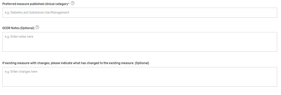 Preferred measure published clinical category* – Please provide a preferred clinical or specialty category. Please note that if a preferred measure published clinical category is not provided, one will be assigned to the measure by CMS. Example: Diabetes and Substance Use/Management.