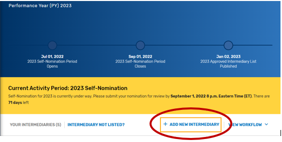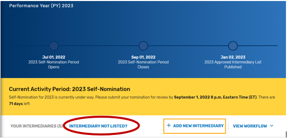 Find your intermediary name in the list on the Intermediary landing page with the Self-Nomination Form “Partially Renewed” status.