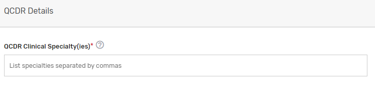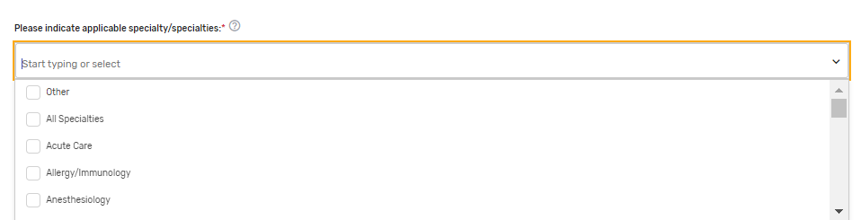 Please indicate applicable specialty/specialties* – Select 1 or more applicable specialties. Multiple specialties can be selected. If “Other” is selected, please enter free text in the “Other Specialties” text box that appears.