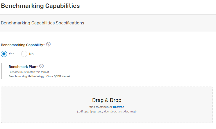 Benchmarking Capabilities tab (optional) – Allows QCDRs to upload their benchmarking methodology.