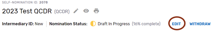 If you wish to withdraw a Self-Nomination form that has already been submitted, click on the “Withdraw” button - withdrawing the entire Self-Nomination form from consideration to participate in MIPS as a prospective QCDR or Qualified Registry. The “Withdraw” option can be found on the Self-Nomination landing page or within the Self-Nomination form.