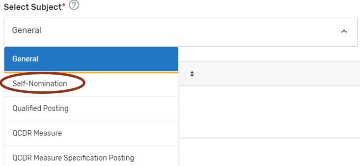 Please make sure to indicate the correct subject in the ‘Select Subject’ dropdown that coordinates with the topic. For example, if you are submitting/responding to a comment on your Self-Nomination form choose the ‘Self-Nomination’ category from the ‘Select Subject’ dropdown.