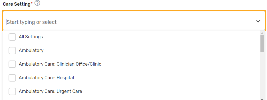 Care Setting* – Select all applicable care settings that are included within the QCDR measure. If “Other” is selected, a text box will appear for free text to be entered.