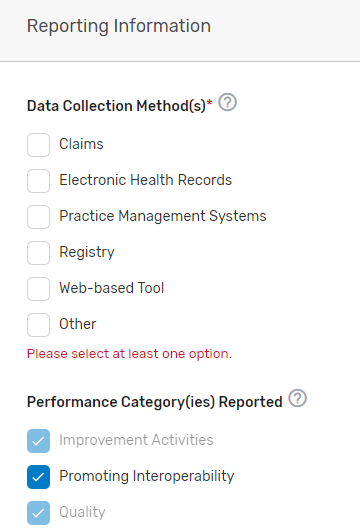 Promoting Interoperability tab – Intermediaries are required to select the Promoting Interoperability objectives and measures supported for the 2023 MIPS performance period. For the Promoting Interoperability performance category, if the MIPS eligible clinician, group, virtual group, or subgroup1 is using certified electronic health record technology (CEHRT); the third-party intermediary may be excepted from this requirement if ALL its MIPS eligible clinicians, groups, virtual groups, or subgroups fall under the reweighting policies. Health Information Technology (IT) vendors are required to submit data for at least one category. For more information, please see the 2022 MIPS Promoting Interoperability User Guide.