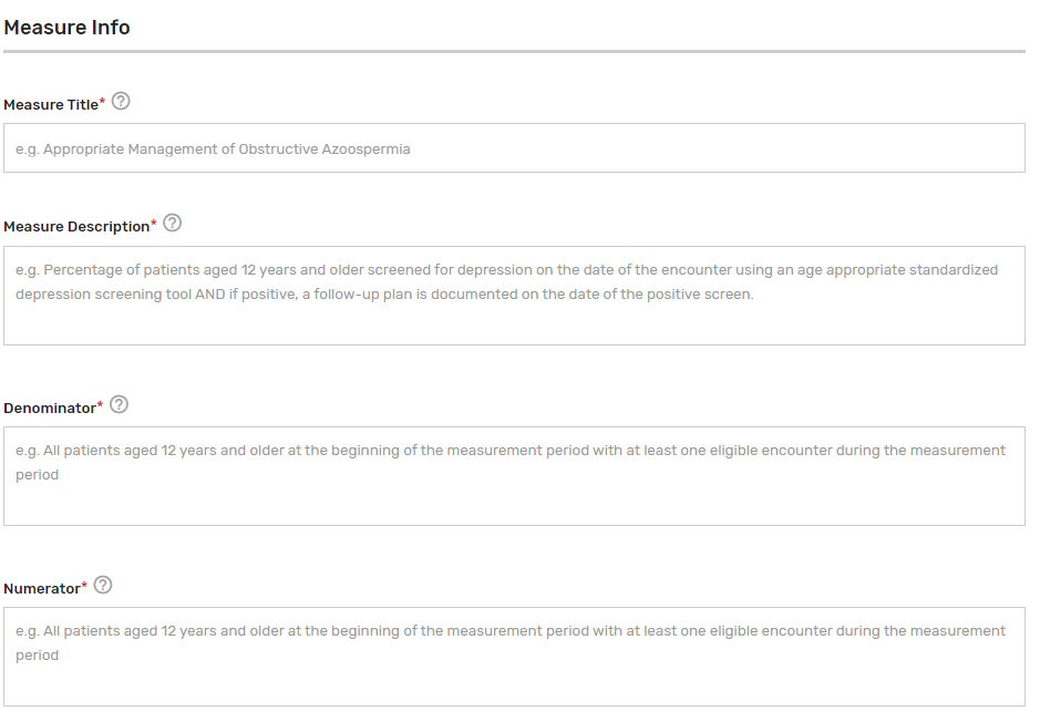 Measure Description* – Describe the measure in full detail. Example: Percentage of patients aged 12 years and older screened for depression on the date of the encounter using an age-appropriate standardized depression screening tool and if positive, a follow-up plan is documented on the date of the positive screen.