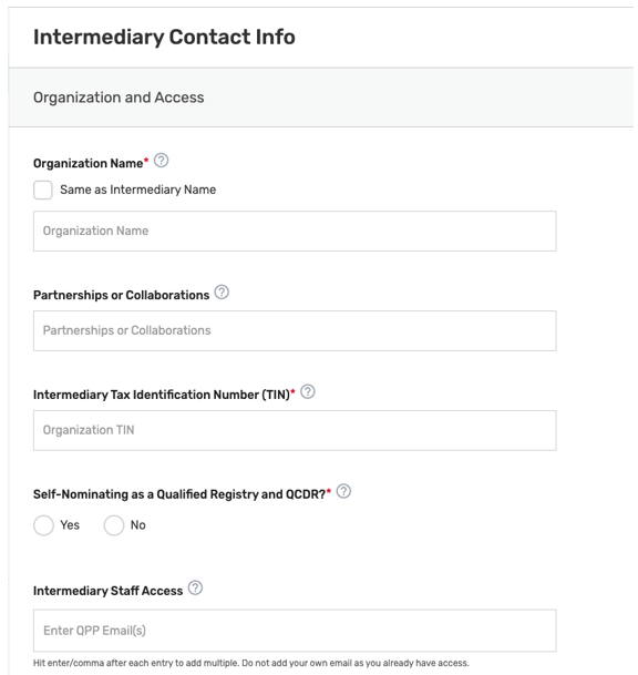 Enter your intermediary name (to be displayed on Qualified Posting) and indicate your prospective QCDR’s or Qualified Registry’s intermediary type. Please ensure you have selected the correct intermediary type, as this may affect your application. If you would like to self-nominate to become both a QCDR and Qualified Registry, you must complete an application for each intermediary type.