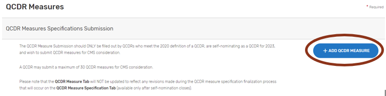 QCDR Measures tab (optional) – Allows QCDRs to provide QCDR measures and/or supplemental QCDR measure documentation for consideration for the 2023 performance period. To utilize this QCDR measures tab your intermediary must choose ‘Yes’ under the “Do you plan to submit QCDR Measures?” question on the Intermediary Details tab to submit your QCDR measures. Please note, QCDRs who plan to submit QCDR measures for CMS consideration, must complete this tab.
