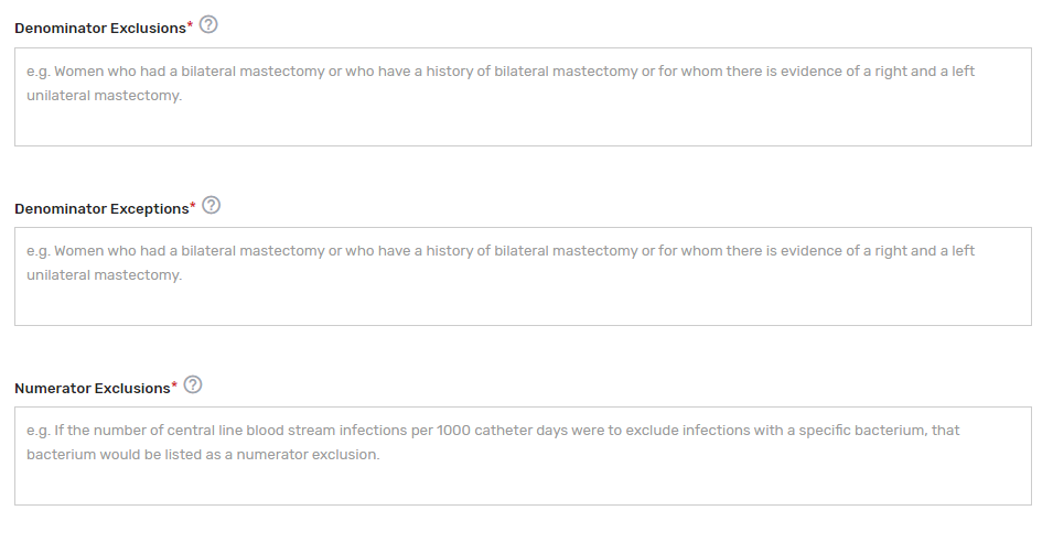 Numerator Exclusions* – Provide a numerator exclusion that would remove the patient, procedure, or unit of measurement from the numerator, used only in ratio measures. Applied before the numerator calculation. Enter “N/A” if not applicable. Example: If the number of central line blood stream infections per 1,000 catheter days were to exclude infections with a specific bacterium, that bacterium would be listed as a numerator exclusion.