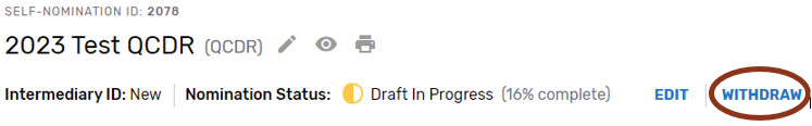 If you wish to withdraw a Self-Nomination form that has already been submitted, click on the “Withdraw” button - withdrawing the entire Self-Nomination form from consideration to participate in MIPS as a prospective QCDR or Qualified Registry. The “Withdraw” option can be found on the Self-Nomination landing page or within the Self-Nomination form.