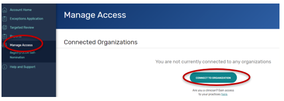 Once you have created an account and logged in, you will land on the Manage Access page in the QPP website and will see the “Registry/QCDR Self-Nomination” link to access the Self-Nomination form for QCDRs/Qualified Registries. You will see the organizations that you are connected to listed on the Manage Access page. If you are not seeing an existing intermediary that is active on the QPP website that you need to self-nominate, then you will need to click on “Connect to an Organization” and connect to that organization and request the “Security Official” role.