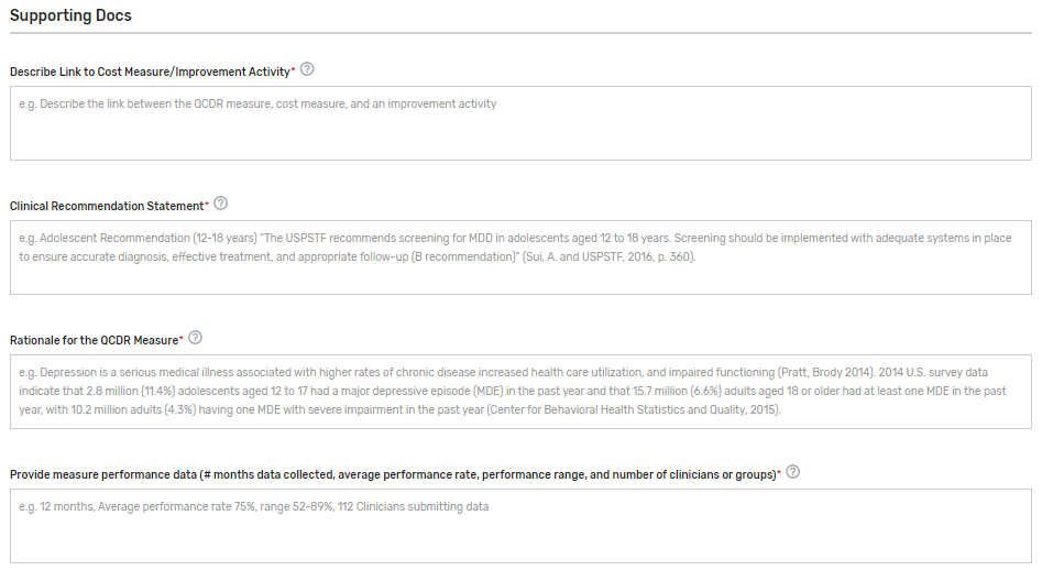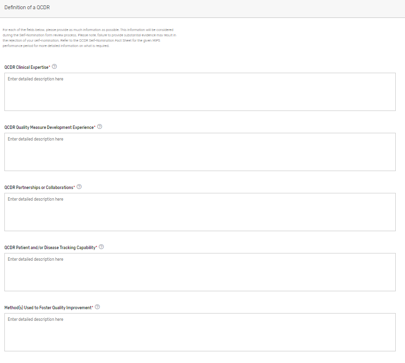 Disclaimer: A majority of the screenshots used in this section of the User Guide were taken from the QCDR Self-Nomination form. Corresponding fields of the Qualified Registry Self-Nomination form may slightly differ.