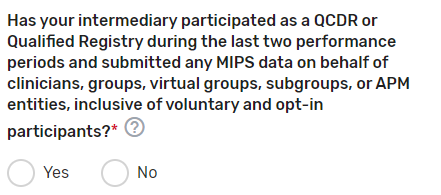 Promoting Interoperability tab – Intermediaries are required to select the Promoting Interoperability objectives and measures supported for the 2023 MIPS performance period. For the Promoting Interoperability performance category, if the MIPS eligible clinician, group, virtual group, or subgroup1 is using certified electronic health record technology (CEHRT); the third-party intermediary may be excepted from this requirement if ALL its MIPS eligible clinicians, groups, virtual groups, or subgroups fall under the reweighting policies. Health Information Technology (IT) vendors are required to submit data for at least one category. For more information, please see the 2022 MIPS Promoting Interoperability User Guide.