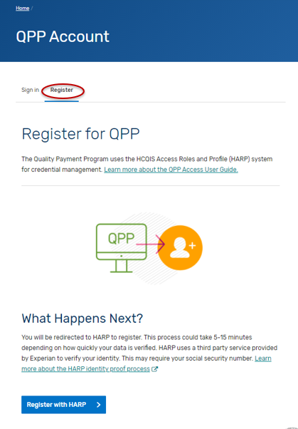 Register for a Health Care Quality Information Systems (HCQIS) Access Roles and Profile (HARP) Account - Gives step-by-step instructions with screenshots for new users (those who have never signed into http://www.qpp.cms.gov) to create an account.