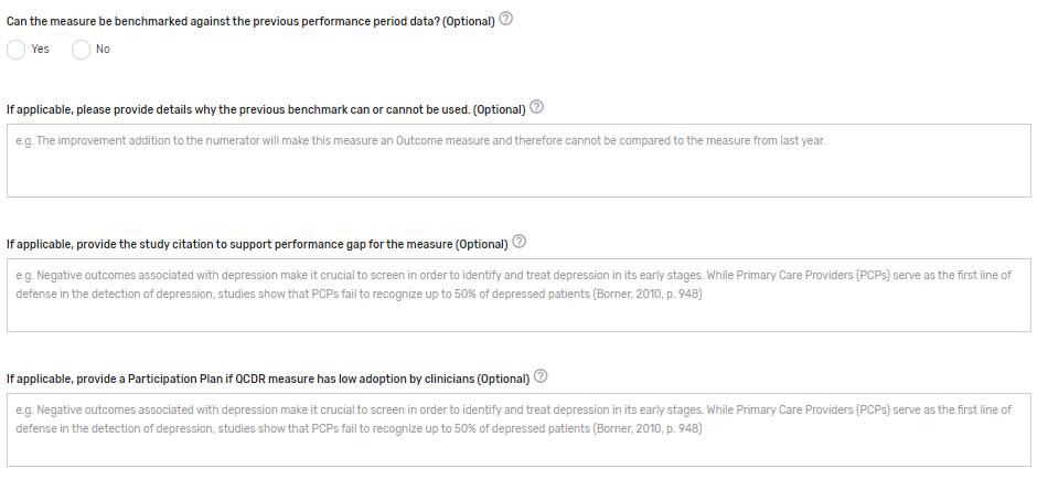 Can the measure be benchmarked against the previous performance period data? Enter "Yes" or "No" to indicate if the benchmark from prior years is able to be used for comparison. If this is an existing measure, an answer is required.