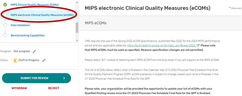 MIPS electronic Clinical Quality Measure (eCQM) tab – Intermediaries may specify the eCQMs supported for the 2023 MIPS performance period. Please note, some MIPS eCQMs are also available as MIPS CQMs and should be used as specified. Changes to the measure specifications are not permitted.