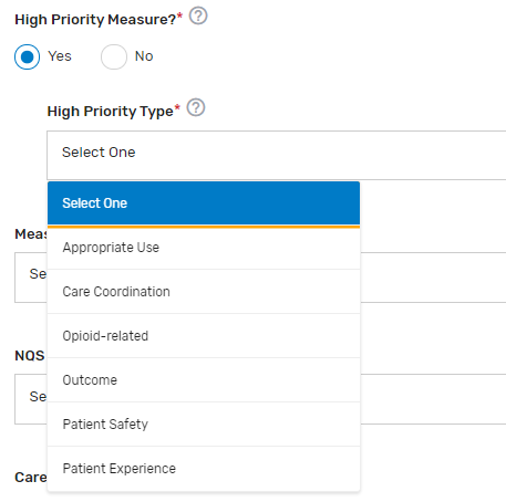 High Priority Type* – If “Yes” is selected for “High Priority Measure?”, select the 1 appropriate high priority measure type from the drop-down list.