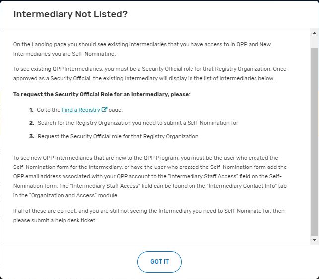 If you are not seeing an intermediary that you know is active on the QPP website, please refer to the Intermediary Not Listed link for instructions on how to connect to that organization via the Manage Access page.