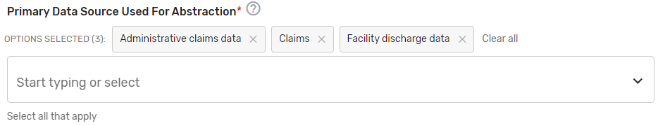 Primary Data Source Used for Abstraction* – Select all applicable primary data sources used for the QCDR measure. This may include, but is not limited to, administrative claims data, facility discharge data, chronic condition data warehouse (CCW), claims, CROWNWeb, EHR (enter relevant parts), Hybrid, Inpatient Rehabilitation Facility – Patient Assessment Instrument (IRF-PAI), Long-term Care Hospital (LTCH) CARE data set, National Healthcare Safety Network (NHSN), Outcomes and Assessment Information Set (OASIS-C1), paper medical record, Prescription Drug Event Data Elements, Patient-Reported Outcomes Measurement Information System (PROMIS), record review, Registry (enter which Registry), Survey, and/or Other (describe source).
