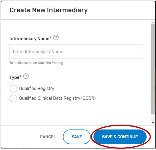 Enter your intermediary name (to be displayed on Qualified Posting) and indicate your prospective QCDR’s or Qualified Registry’s intermediary type. Please ensure you have selected the correct intermediary type, as this may affect your application. If you would like to self-nominate to become both a QCDR and Qualified Registry, you must complete an application for each intermediary type.