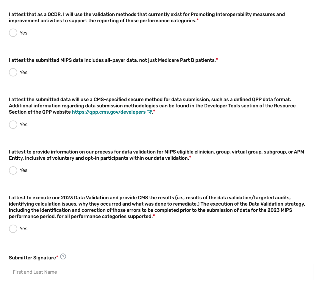 To be considered for the 2023 MIPS performance period, prospective QCDRs and/or Qualified Registries will be required to submit their complete Self-Nomination form (inclusive of MIPS quality measures, QCDR measures (QCDRs only), and data validation) by 8 p.m. ET on September 1, 2022. Intermediaries who intend on participating in MIPS as a QCDR and Qualified Registry must complete and submit a Self-Nomination form for each intermediary type for the 2023 MIPS performance period. CMS will only approve the organization for the intermediary type identified within the Self-Nomination form. Applicants will not be able to update or submit their self-nomination after the deadline. CMS will not review late submissions.