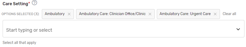 Care Setting* – Select all applicable care settings that are included within the QCDR measure. If “Other” is selected, a text box will appear for free text to be entered.