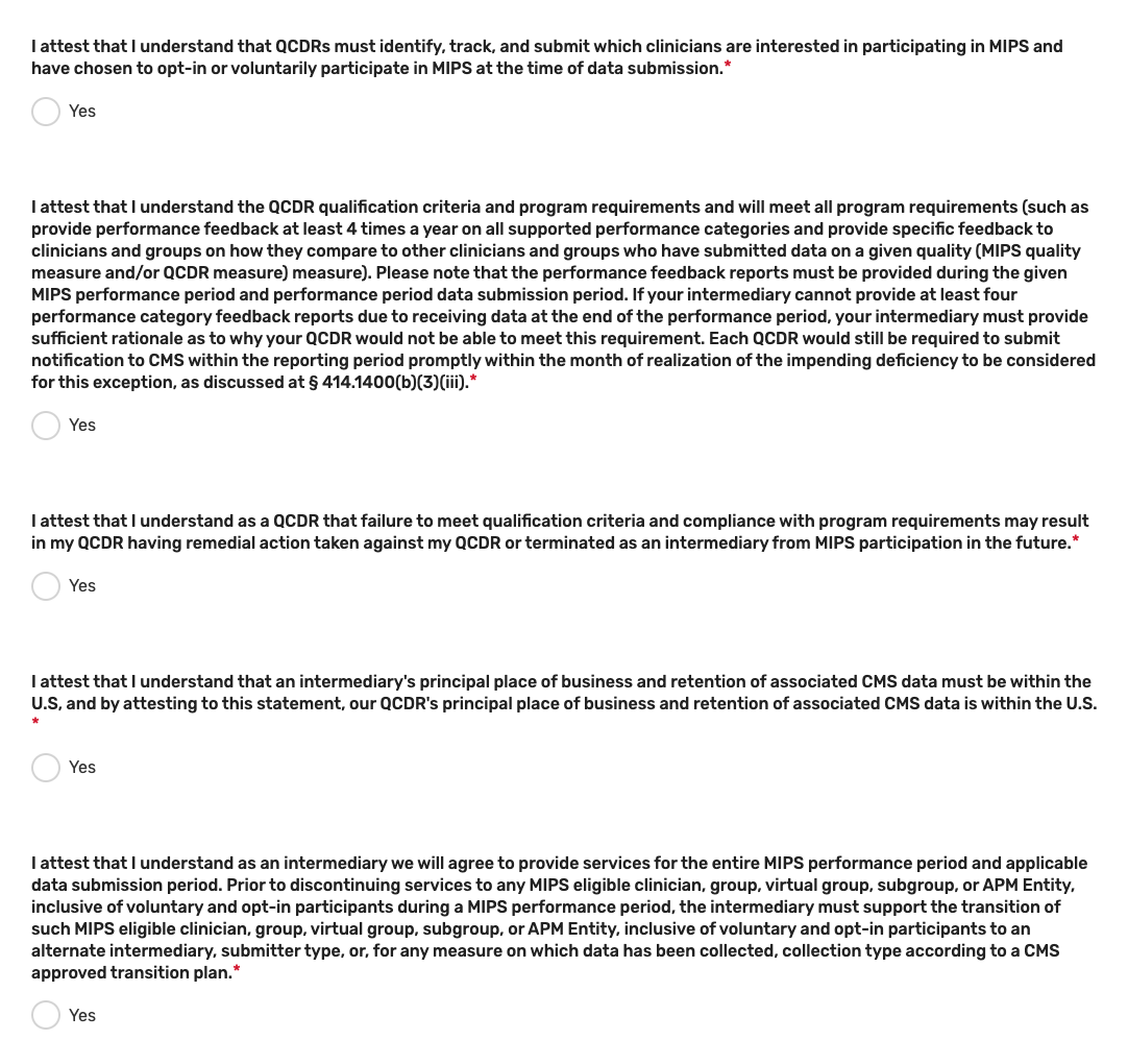 Attestations tab – Intermediaries are required to attest that they understand and are able to meet the participation requirements for the 2023 MIPS performance period.